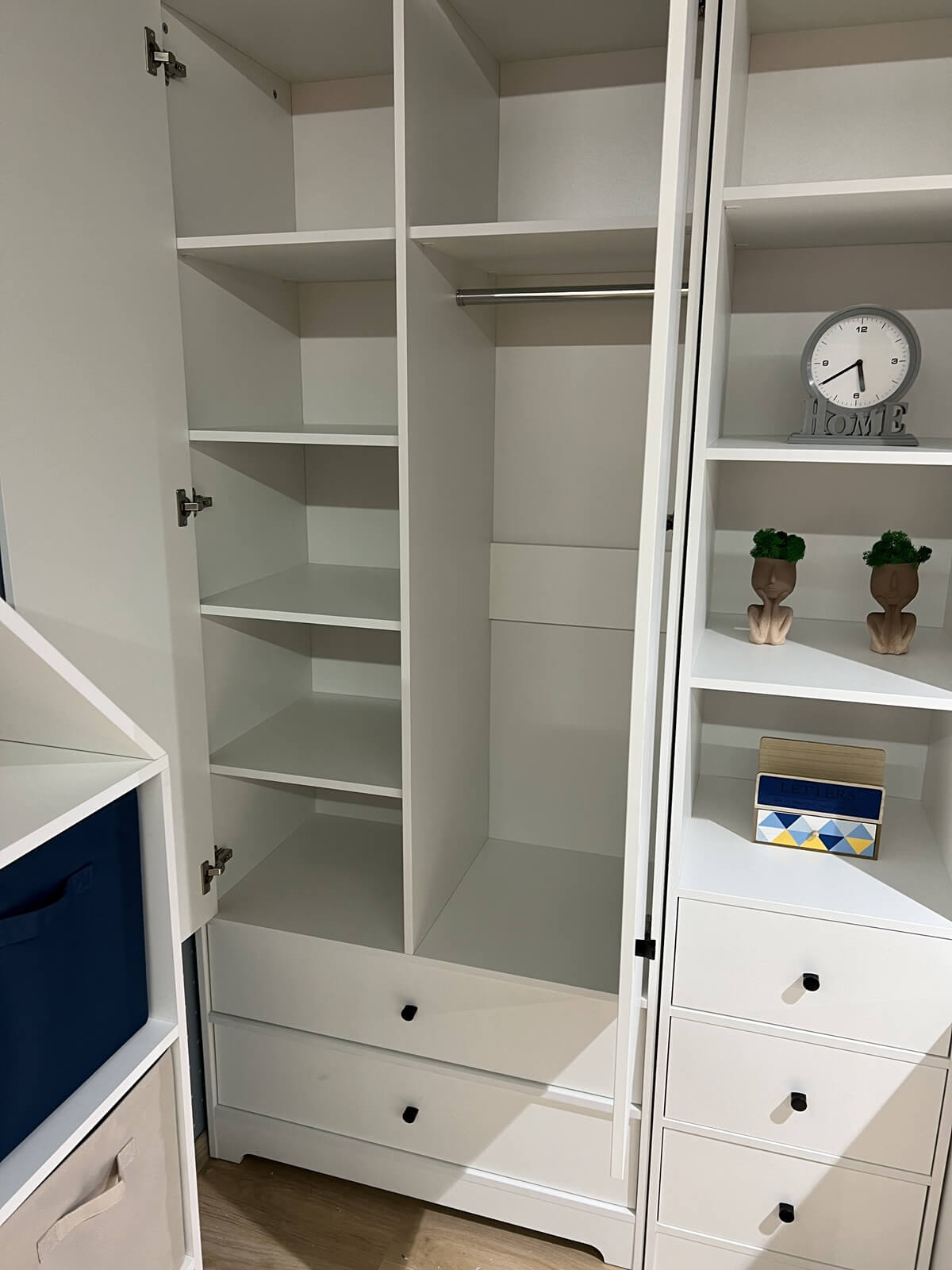 Шкаф поможет максимально грамотно использовать пространство, ведь у него есть два ящика для мелких вещей, штанга, верхние и боковые полки.