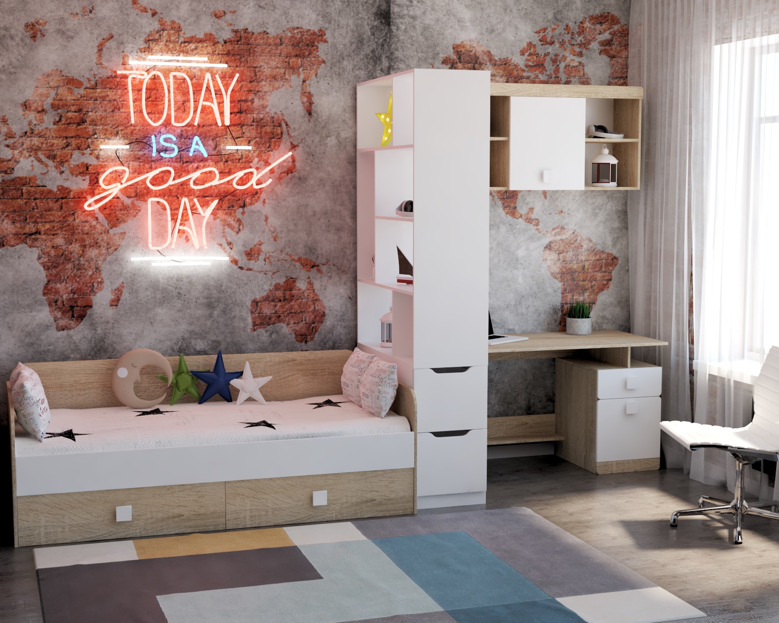Оттенок натурального дерева "дуб сонома" дает ощущение комфорта и единения с природой, а воздушный белый цвет в интерьере работает как основа для ярких штрихов.