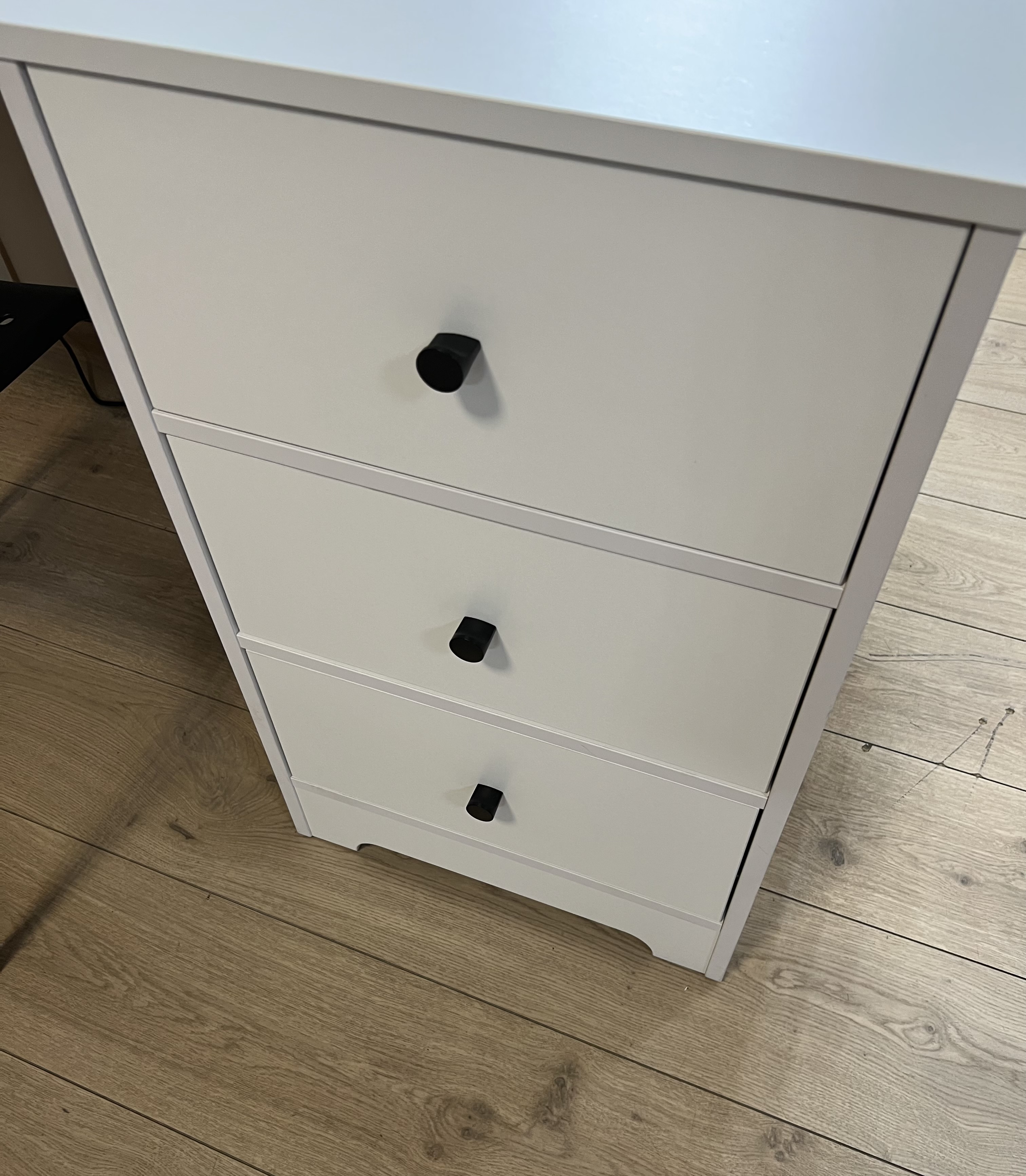 В стол встроены три выдвижных ящика на направляющих скрытого монтажа с ДОВОДЧИКАМИ.