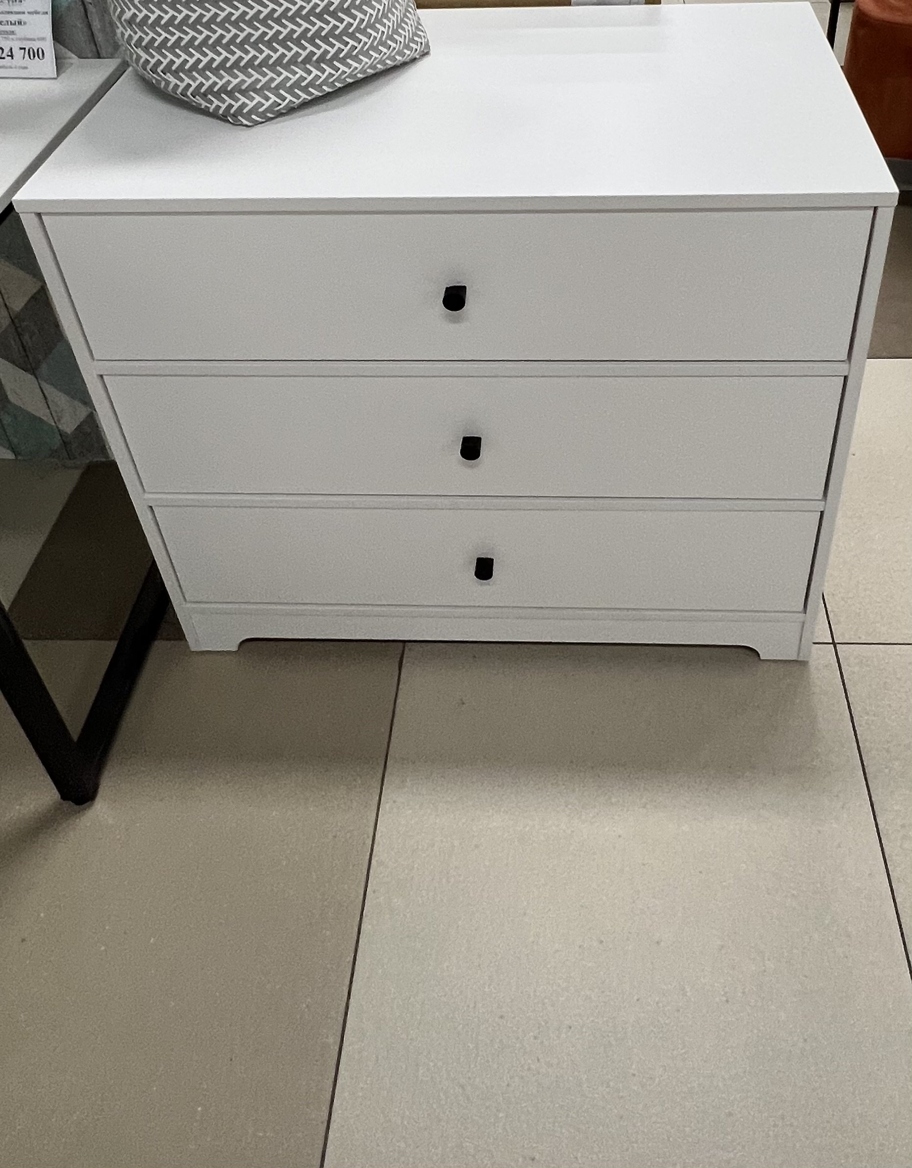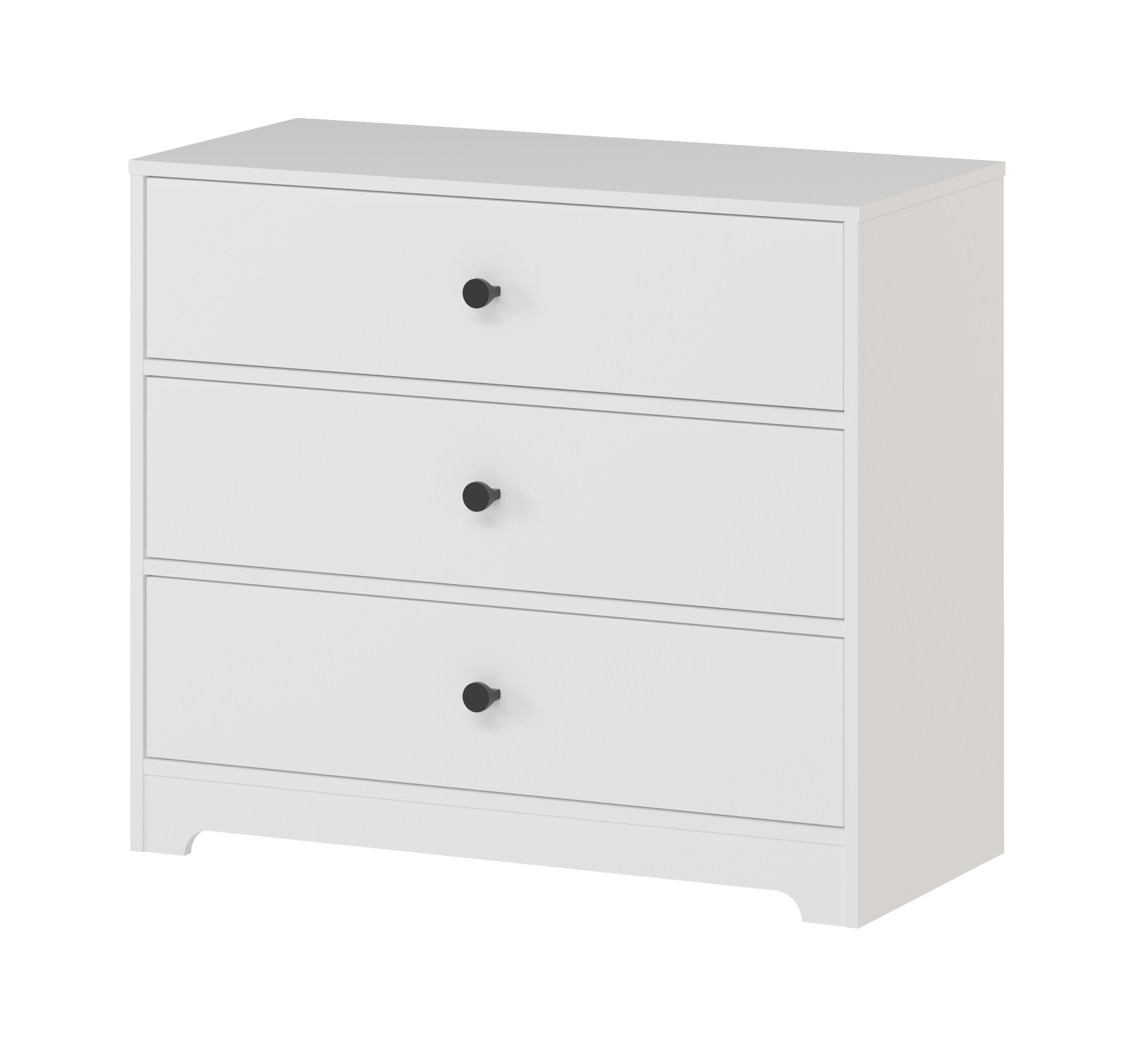 В комод встроены три выдвижных ящика на направляющих скрытого монтажа с ДОВОДЧИКАМИ.