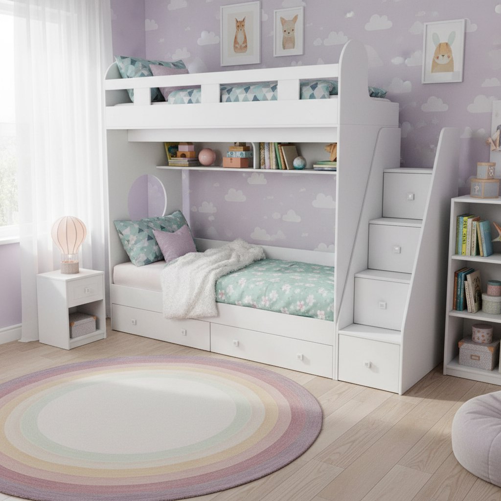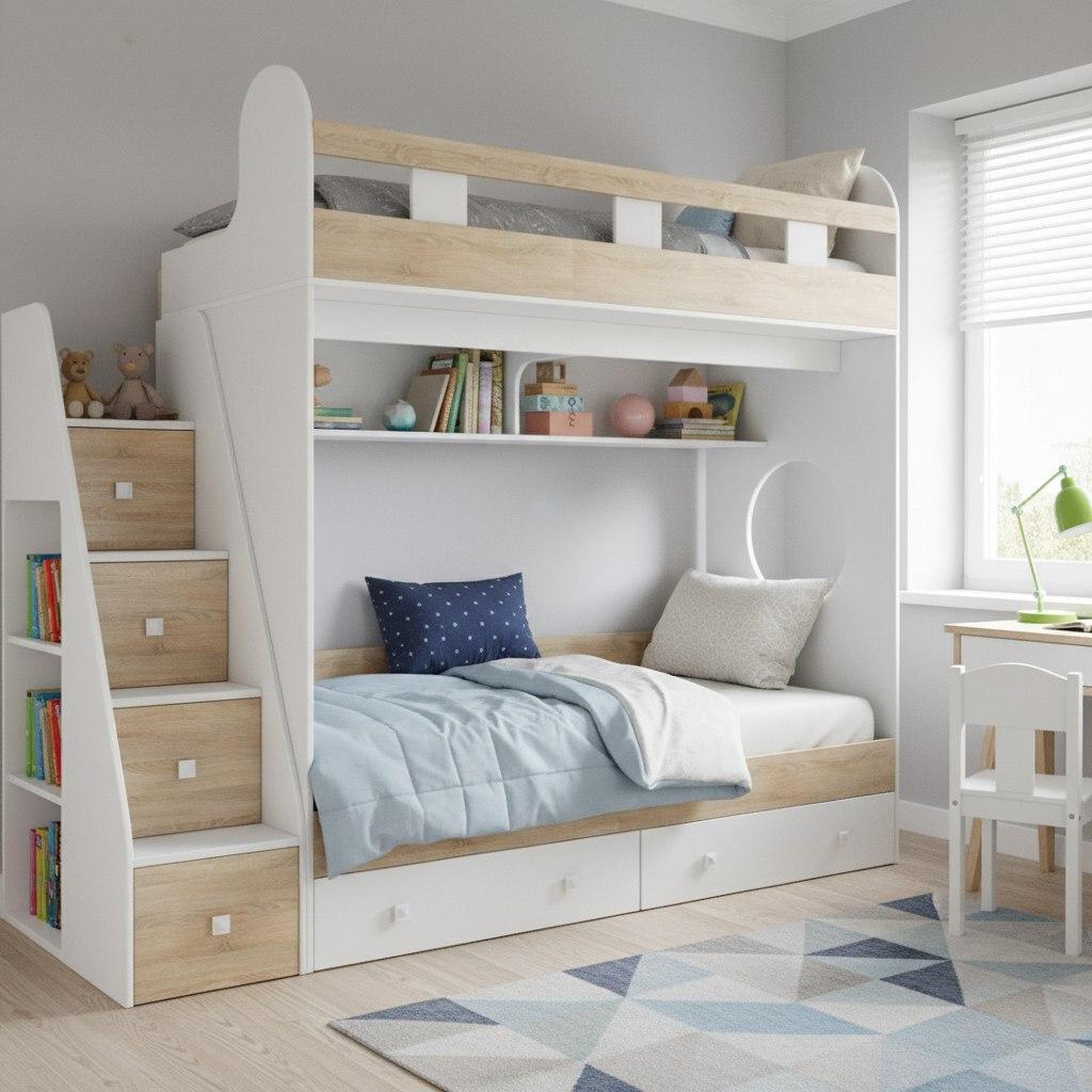 спальное место для двоих, навесная полка для книг и игрушек, вместительные выдвижные ящики под кроватью, а также безопасная лестница, обеспечивающая быстрый и удобный доступ на второй этаж.