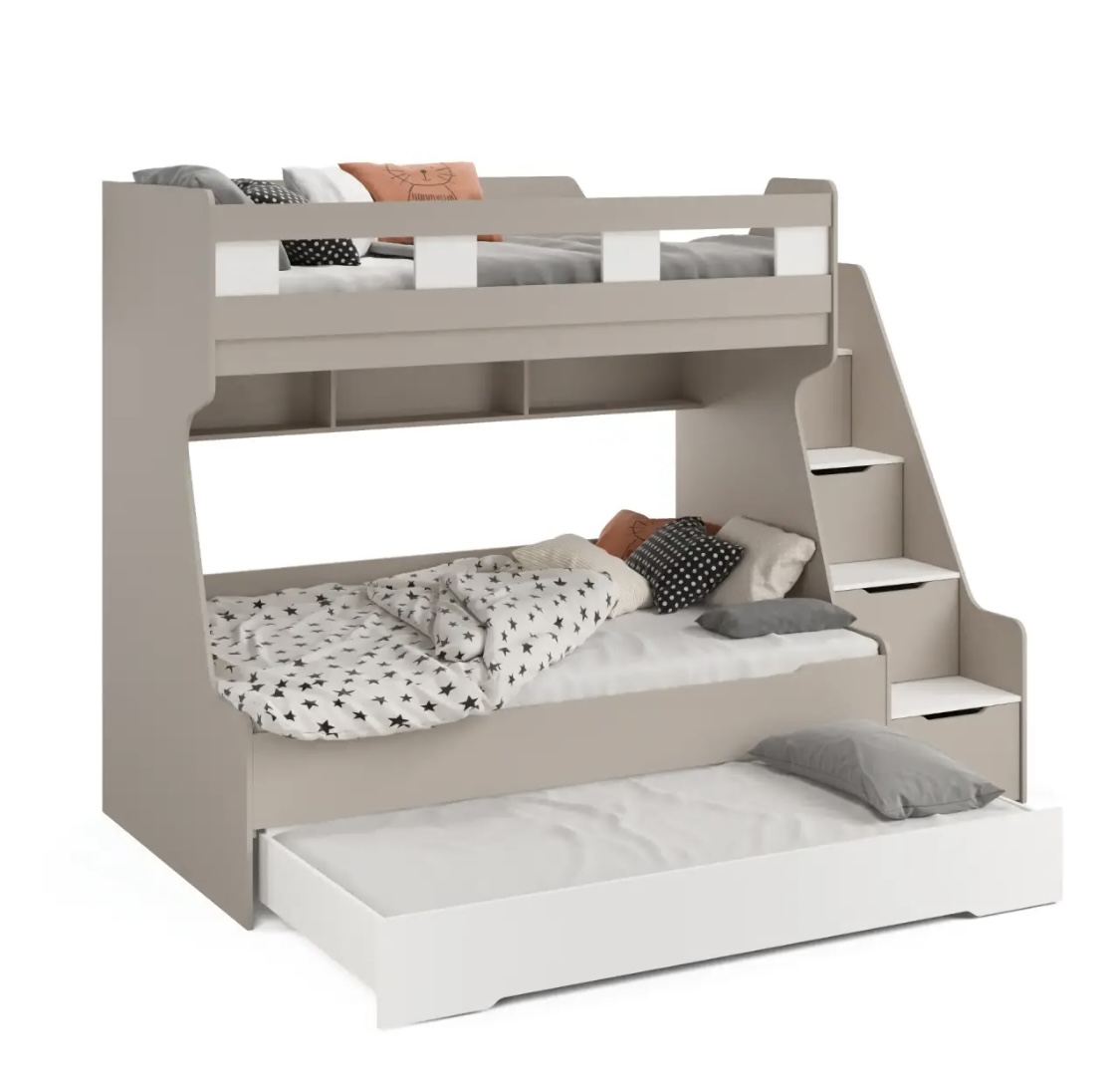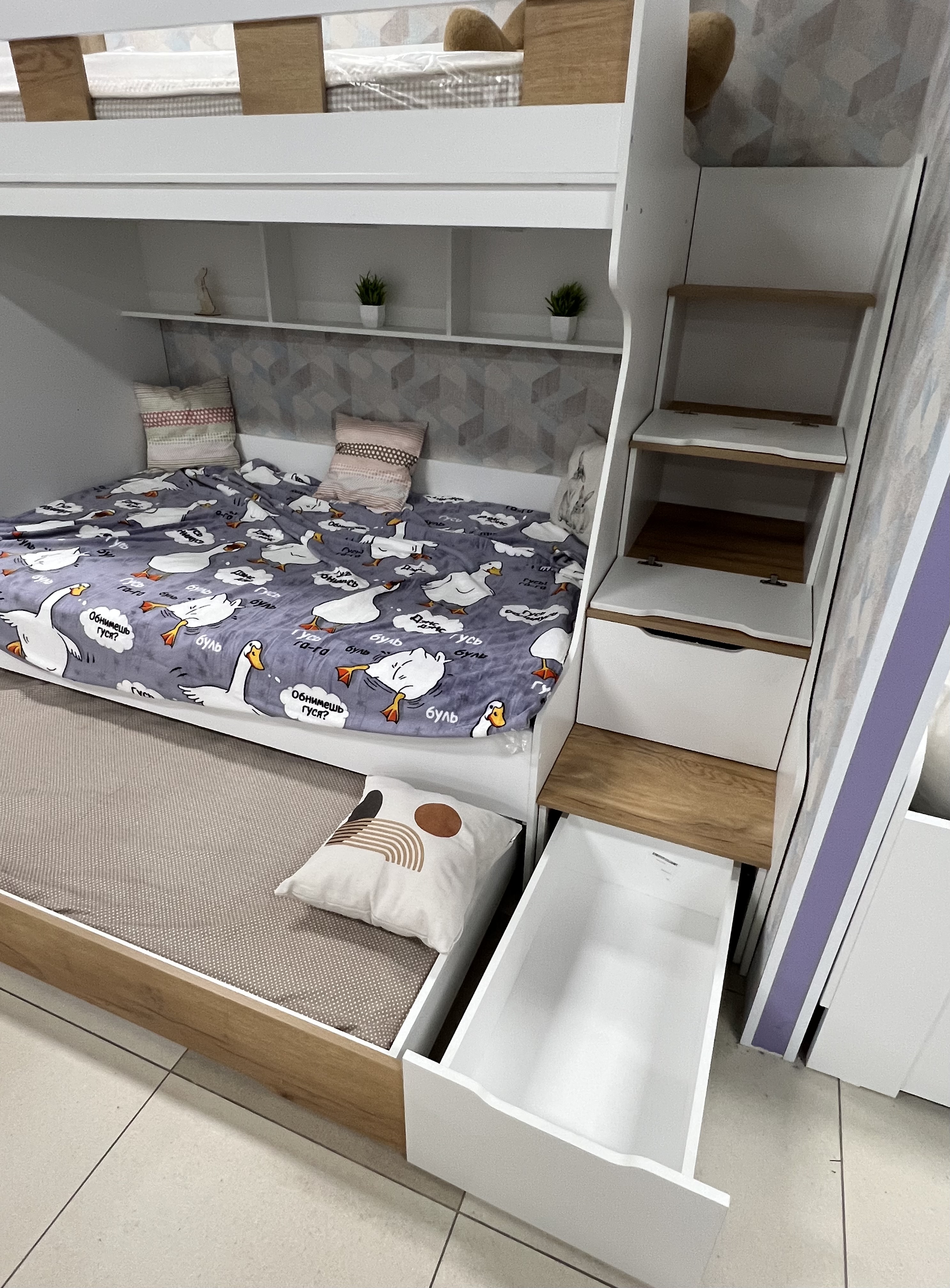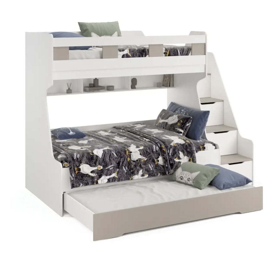 - Максимальная функциональность - два яруса обеспечивают удобство и экономию пространства, а дополнительное спальное место легко выдвигается, когда это необходимо.