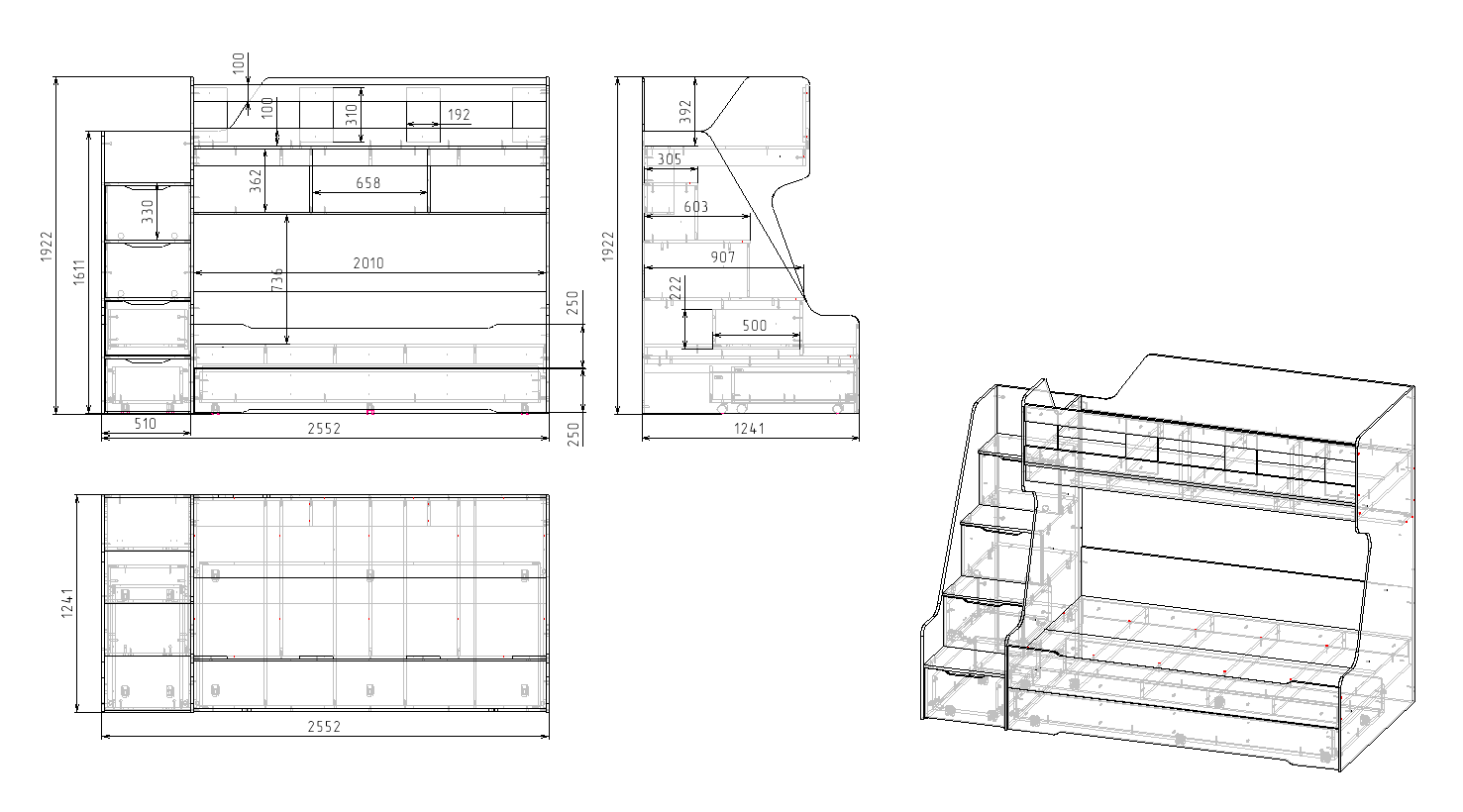 ширина 2552, высота 1922, глубина 1241 мм