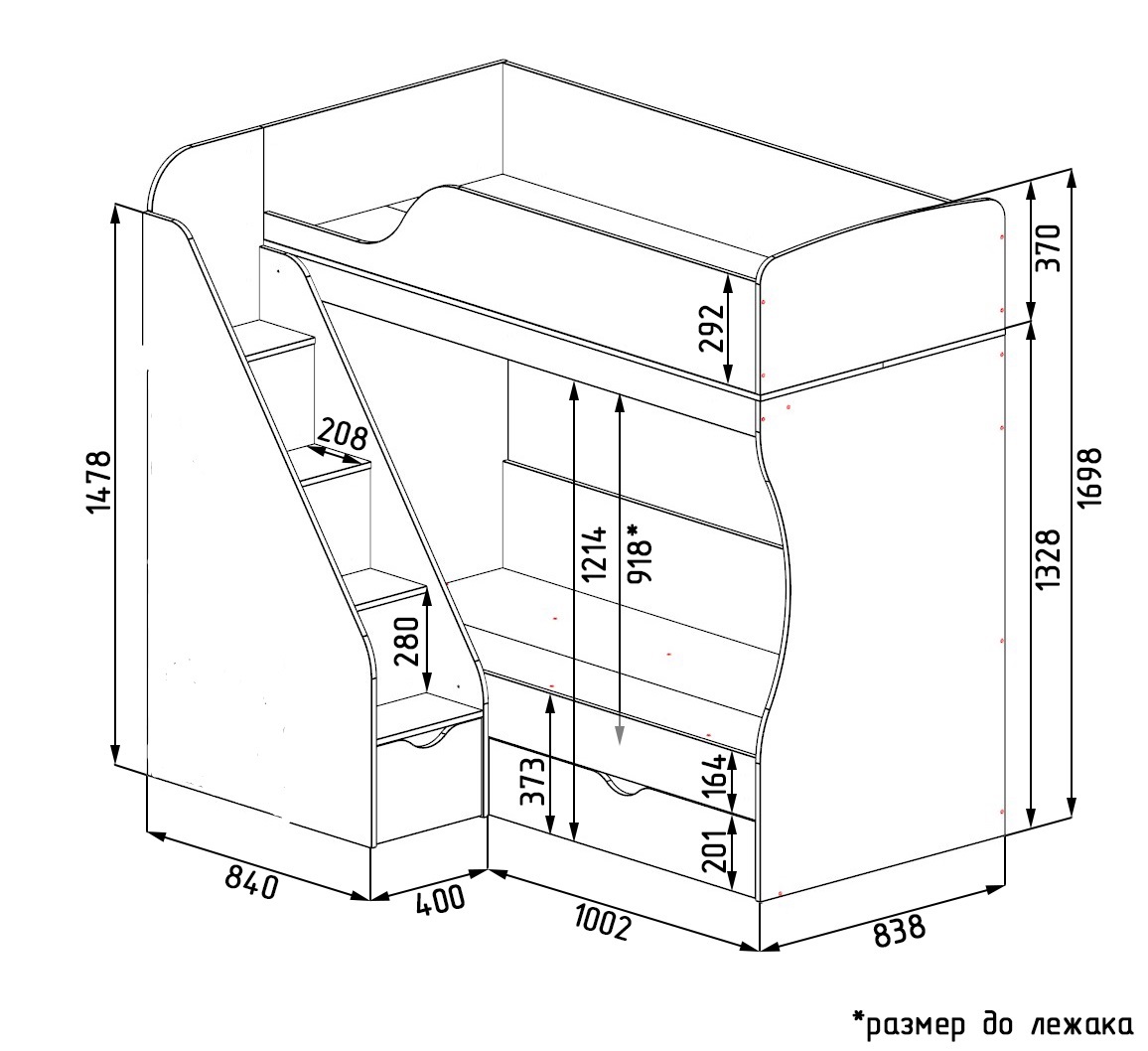 Габариты кровати: ширина 1842 х высота 1698 х глубина с учетом лестницы 1242 мм