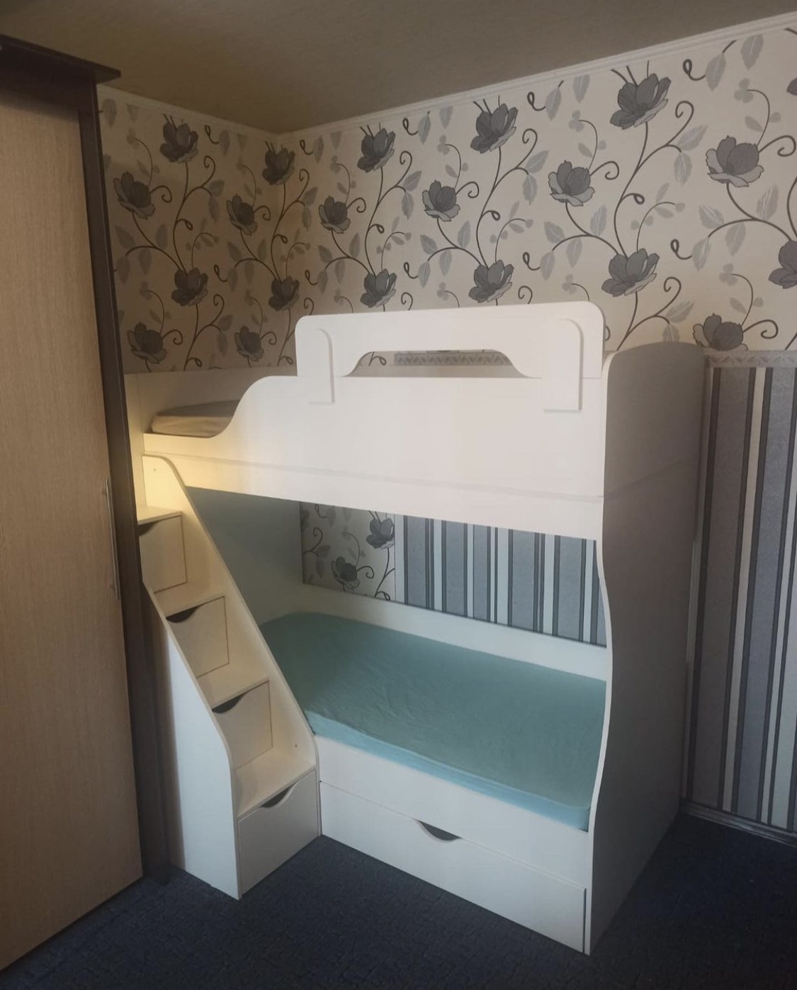 Преимущества данной модели - удобная, безопасная лестница с ящиками для игрушек и комфортная высота кровати.