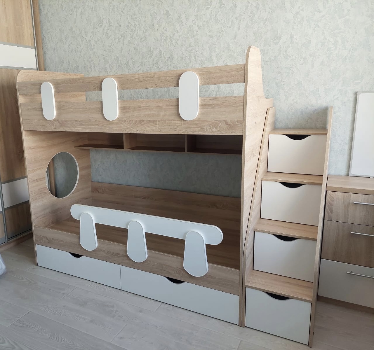 Основание кровати – прочный настил ЛДСП, который позволяет ребенку спать на ровной поверхности, что важно для детской спины.