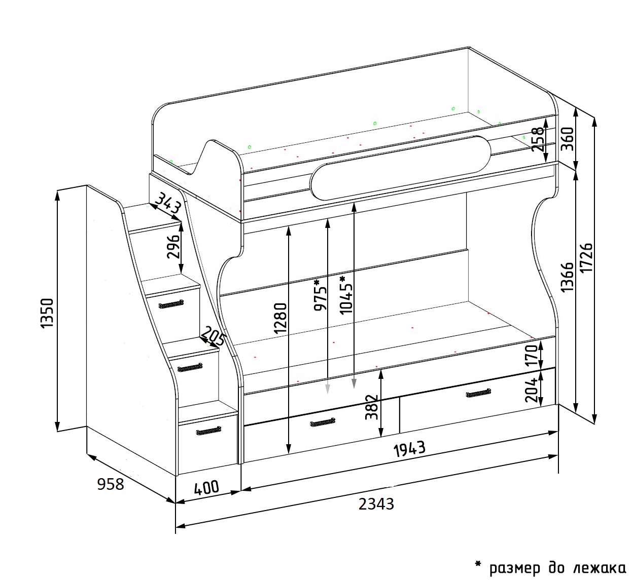 Габариты кровати: ширина с учетом лестницы 2343, глубина 958, высота 1726 мм