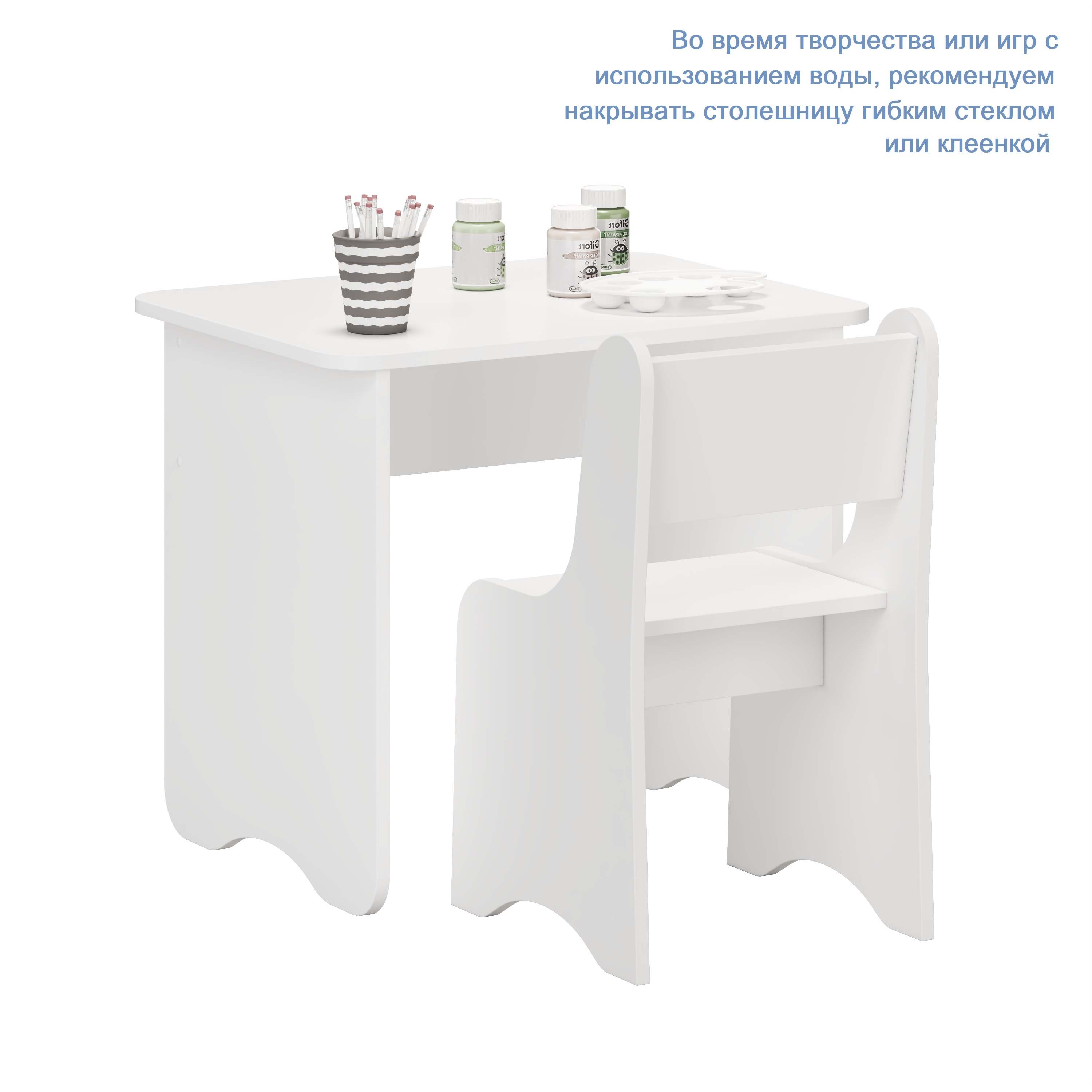 * Для продления срока службы мебели - во время творчества или игр с использованием воды, рекомендуем накрывать столешницу гибким стеклом или клеенкой.