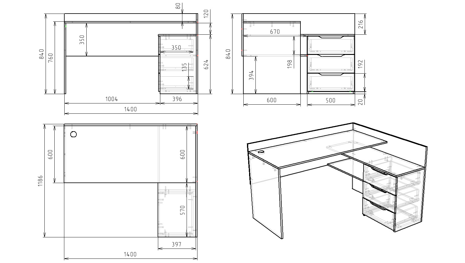 Габариты: ширина 1400, глубина 1186, высота до столешницы 760 мм