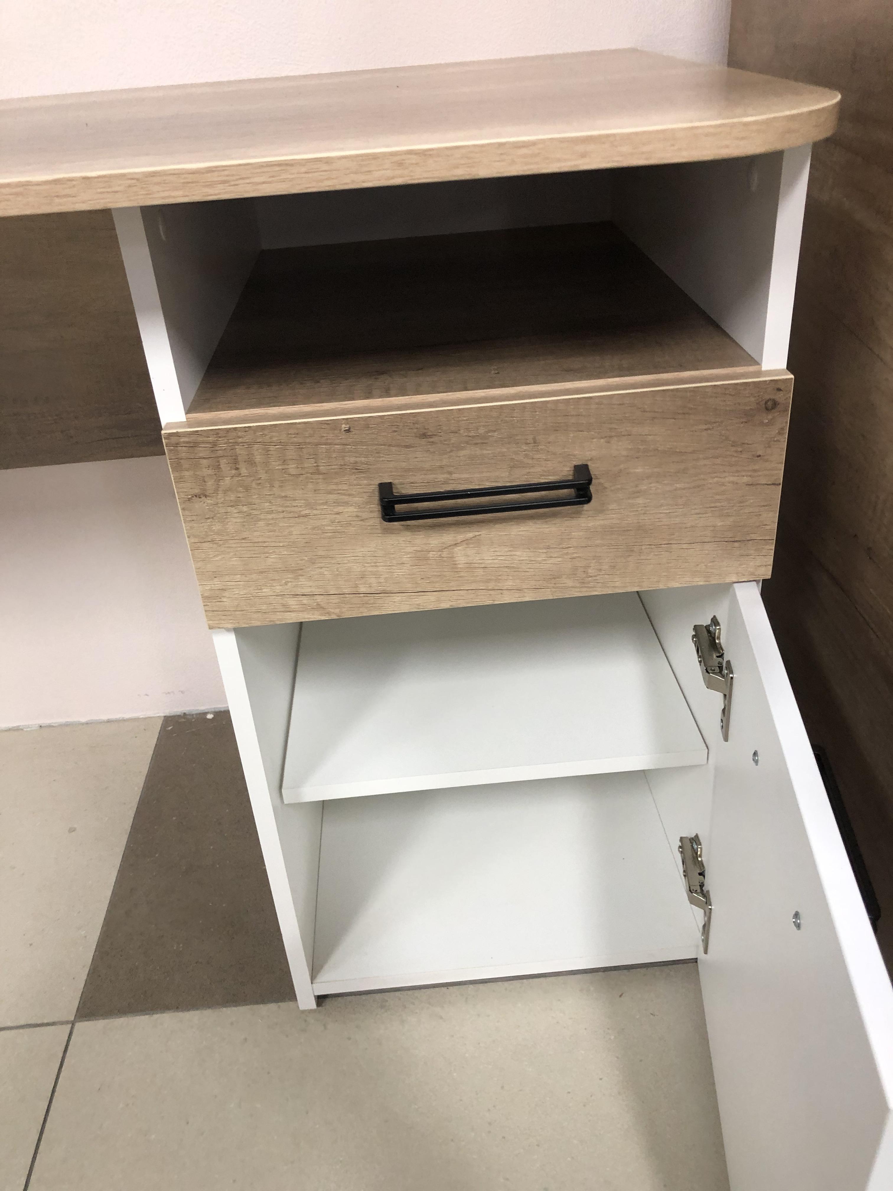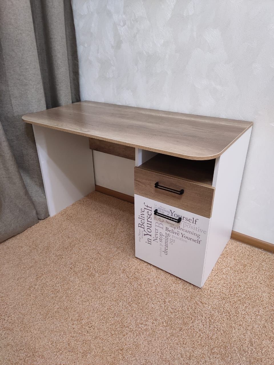 ЛДСП класса Е0,5 в сочетании цветов "дуб каньон + белый" и оформлена дизайнерским принтом.