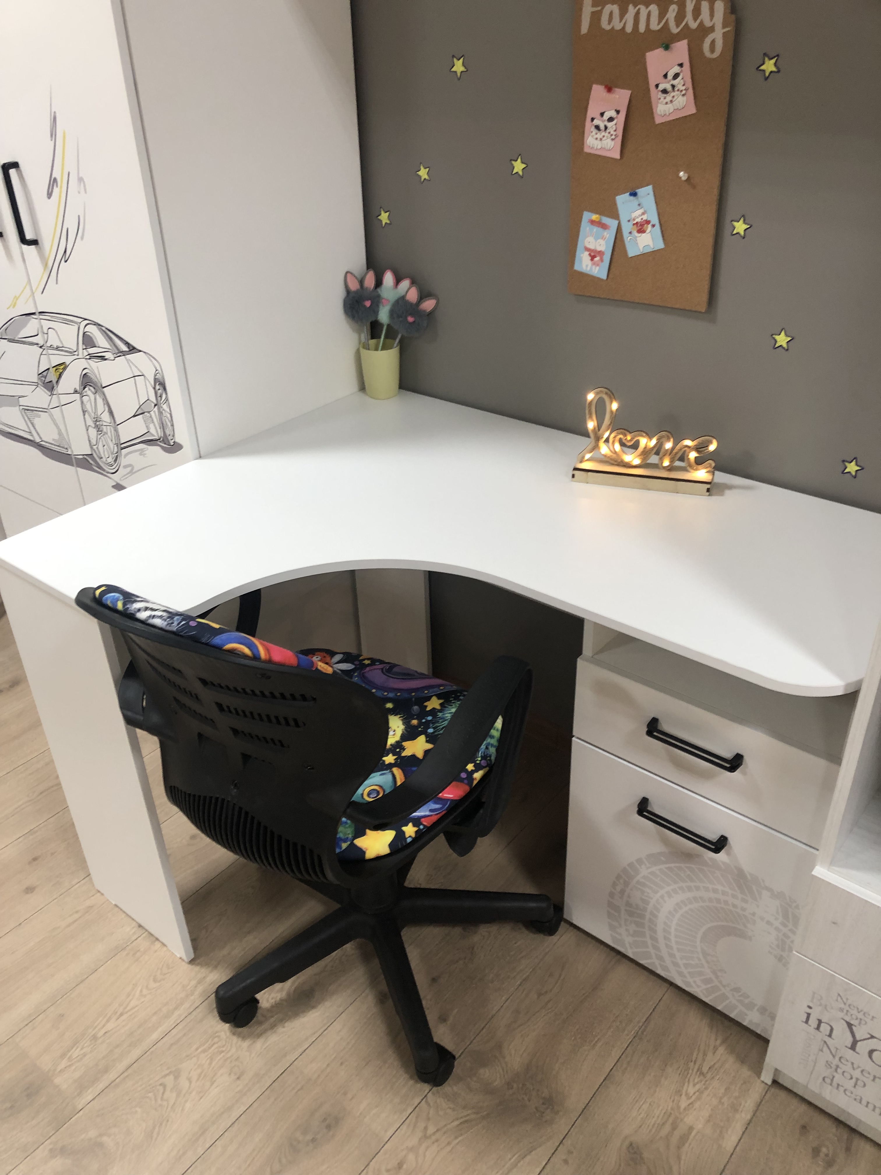 Мебель выполнена из сертифицированного, качественного, экологически чистого ЛДСП класса Е0,5 в белом цвете и оформлена дизайнерским принтом.