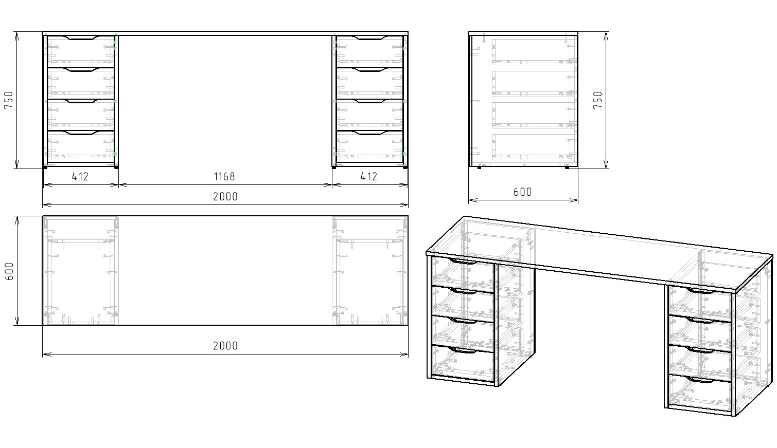 Доводчики, направляющие скрытого монтажа. Столешница и корпус тумб 22 мм. Дно выдвижных ящиков прочное - выполнено из ЛДСП 16 мм (не ДВП!)