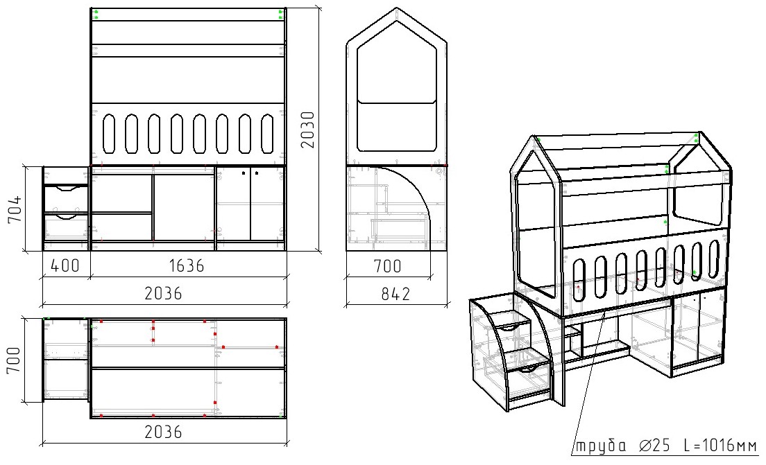 Габариты кровати: ширина 2036, глубина 842, высота 2030 мм