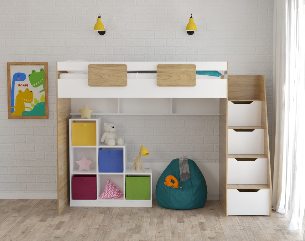 Кровать-чердак Мозаика (правый/левый) + Стеллаж универсальный в белом цвете (правый/левый)