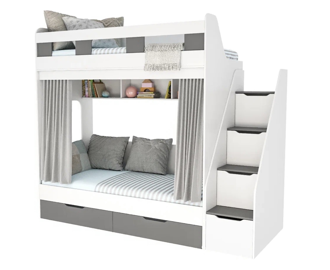 Прочная, стильная двухъярусная кровать Твинс с удобной лестницей, безопасным высоким бортиком и ящиками для хранения.