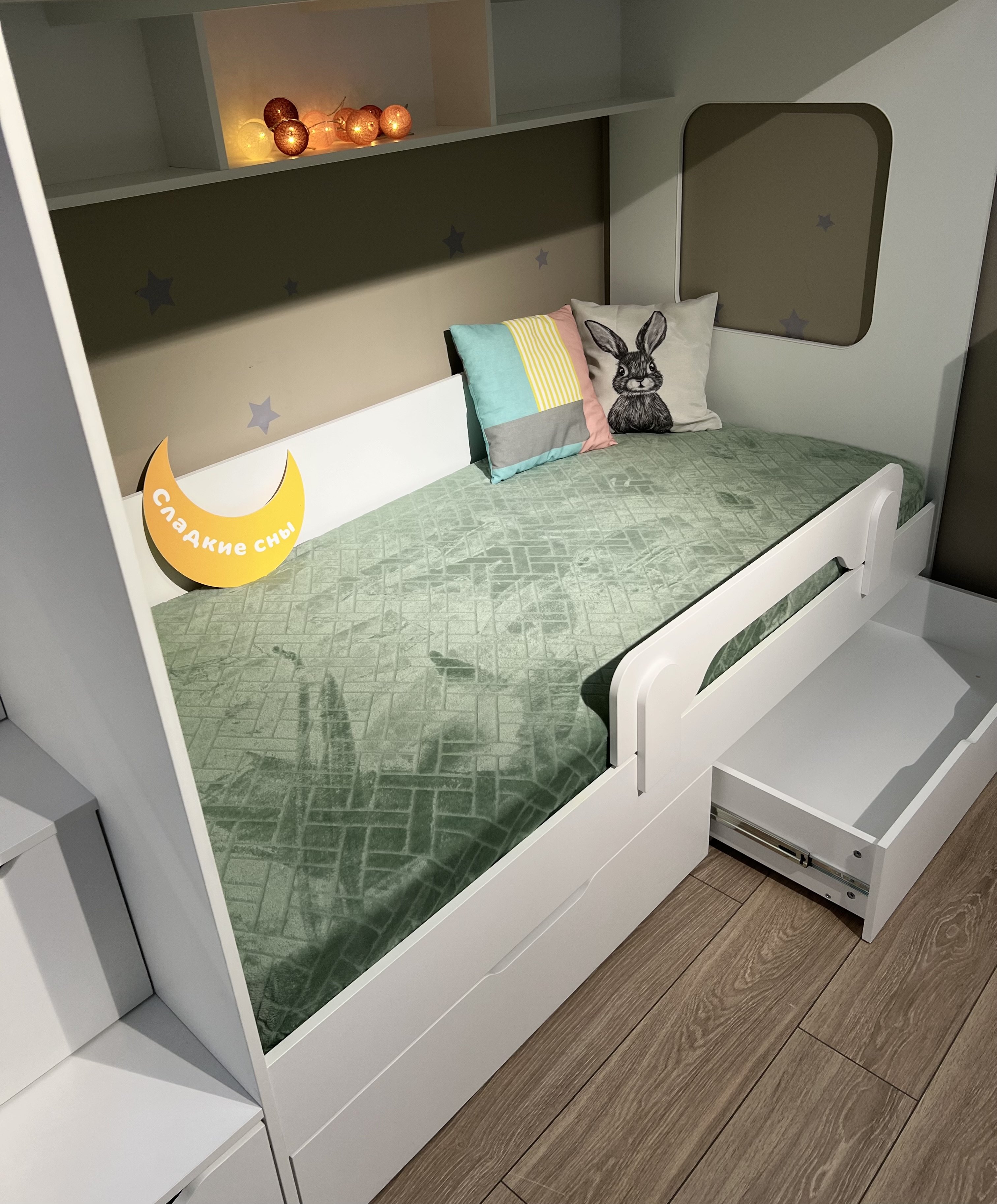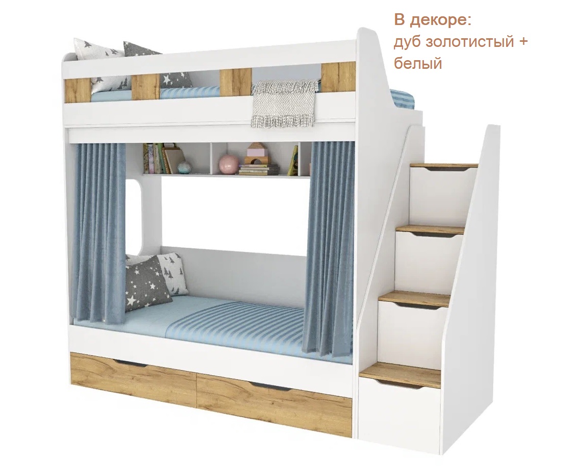 спальное место для двоих, навесная полка для книг и игрушек, вместительные выдвижные ящики под кроватью, а также безопасная лестница расположенная сбоку, обеспечивающая быстрый и удобный доступ на второй этаж, с безопасными ступенями в виде выдвижных ящиков.