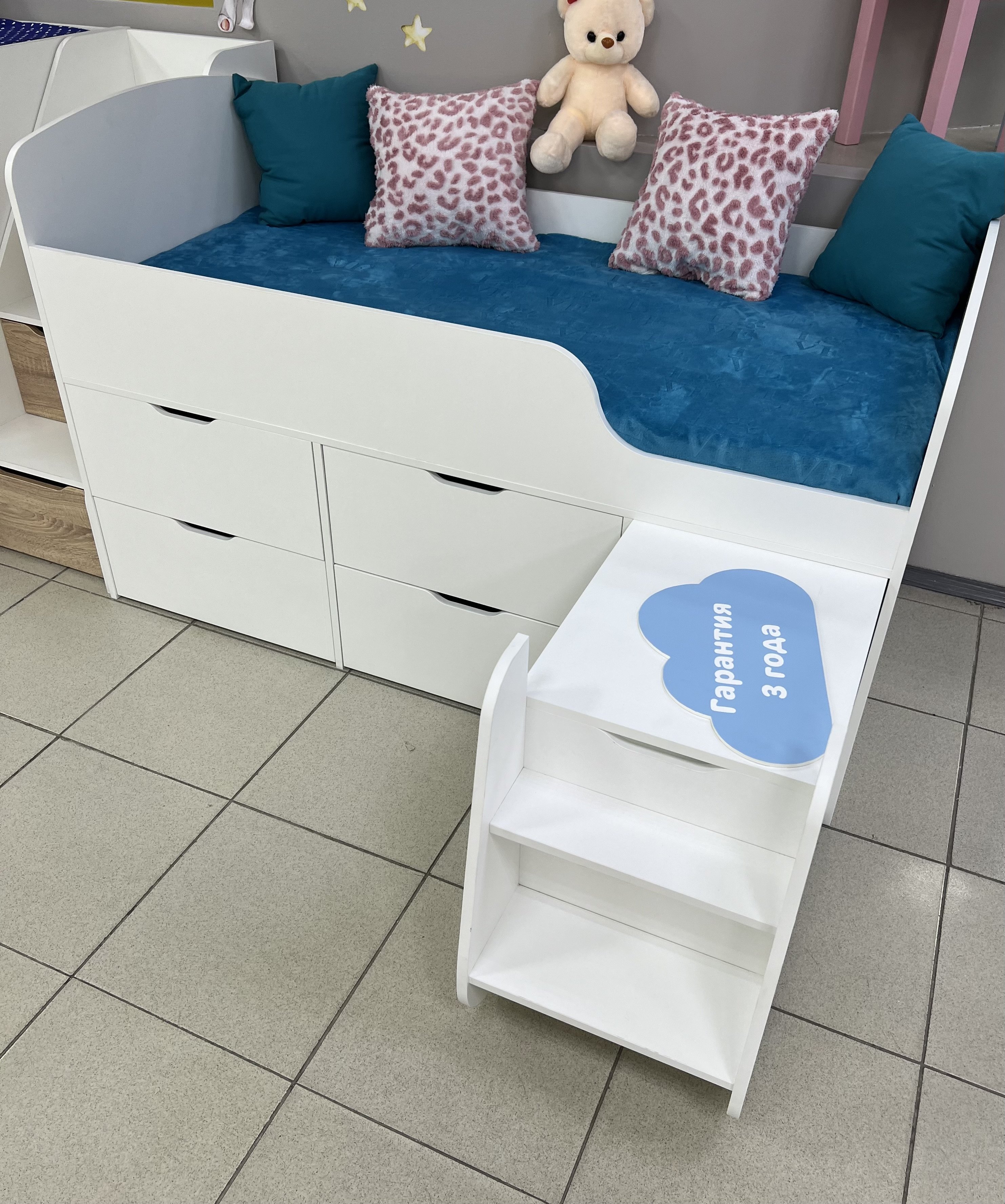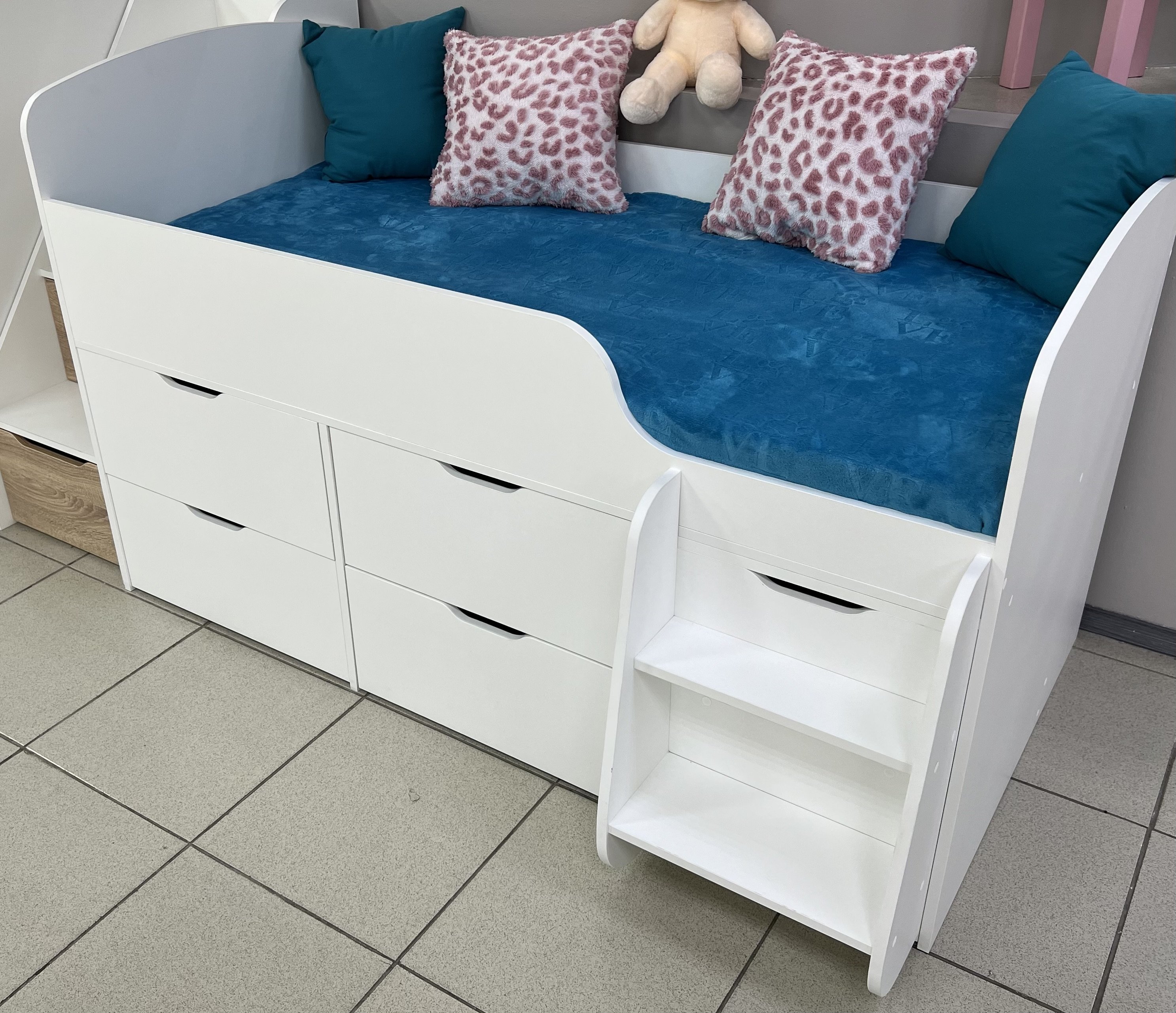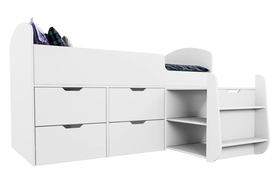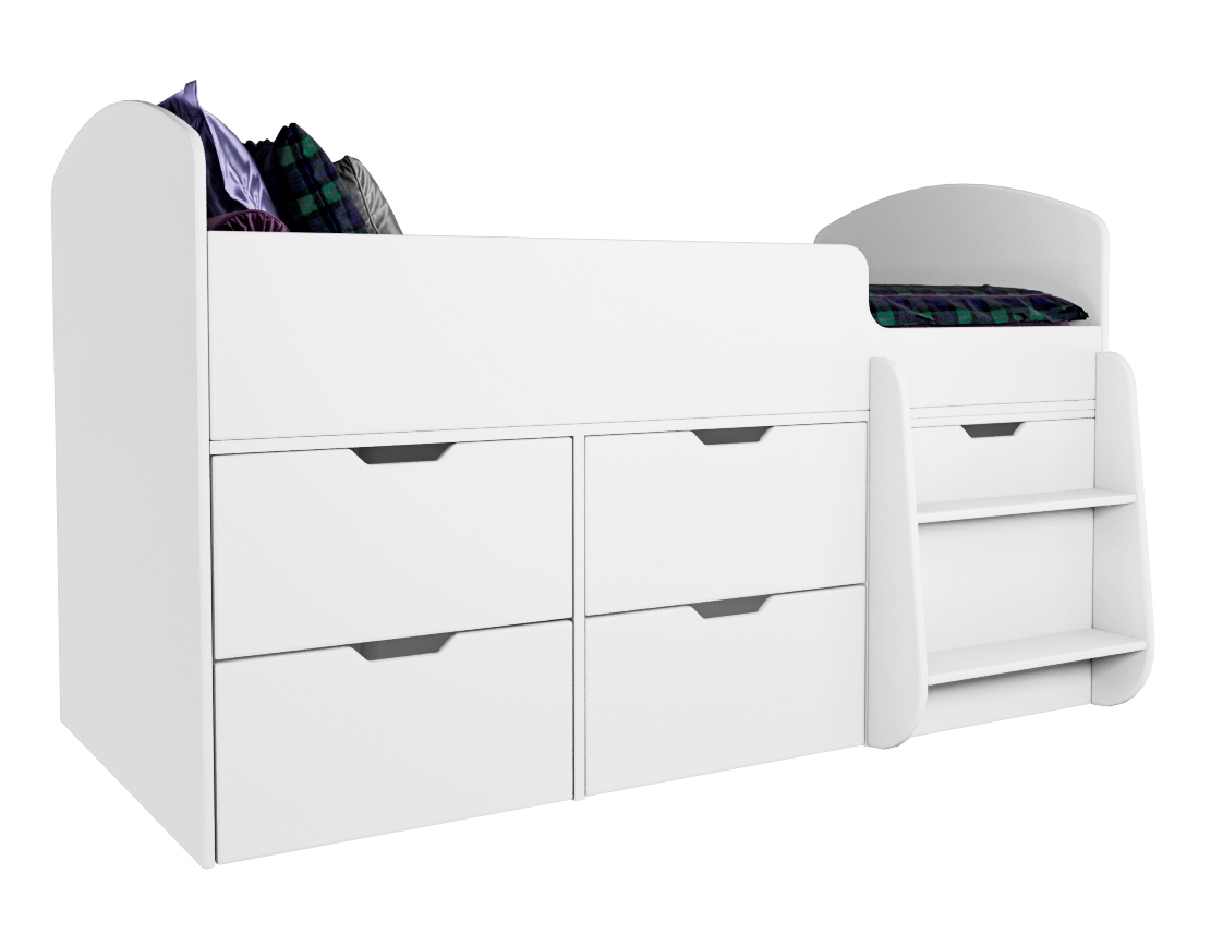 Безопасные бортики, удобная выдвижная лестница с внутренними полочками и небольшая высота кровати сделаны специально для детей младшего возраста.