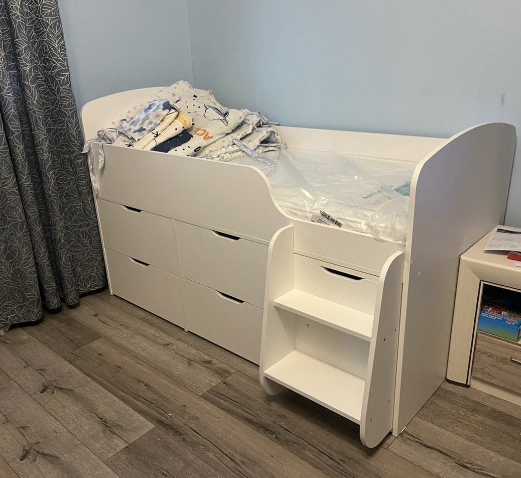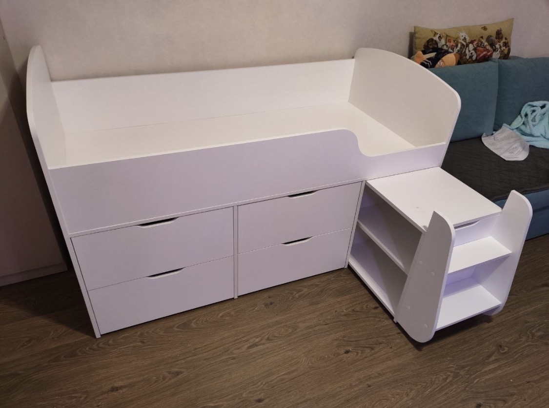<virtues>Все отлично! Очень удобная модель кроватки, плюс большие крепкие ящики. Лесенка легко задвигается. Ребенок доволен! Процветания вам! </virtues>