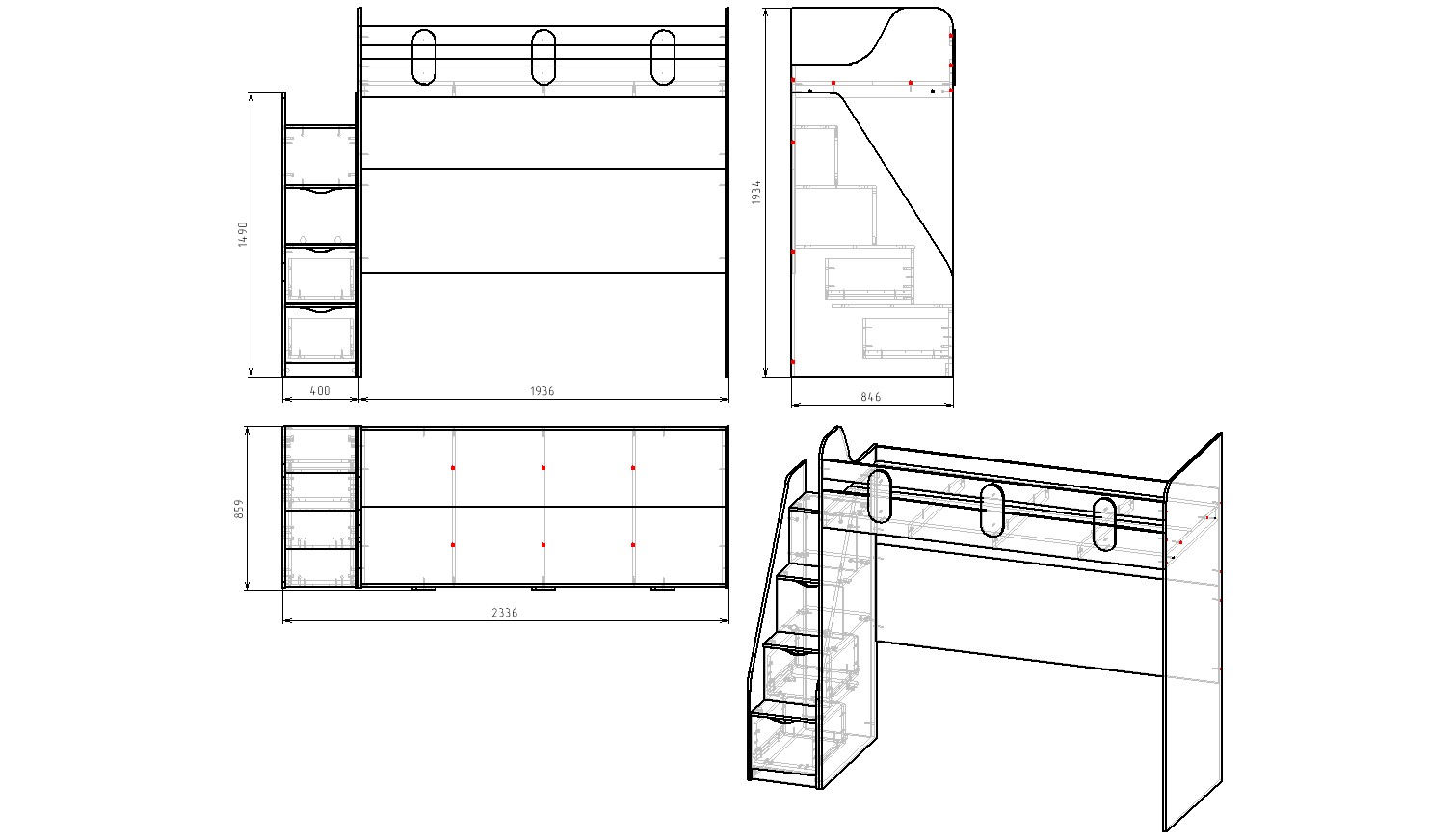 Габариты кровати: ширина с учетом лестницы 2336, глубина 859, высота 1934 мм