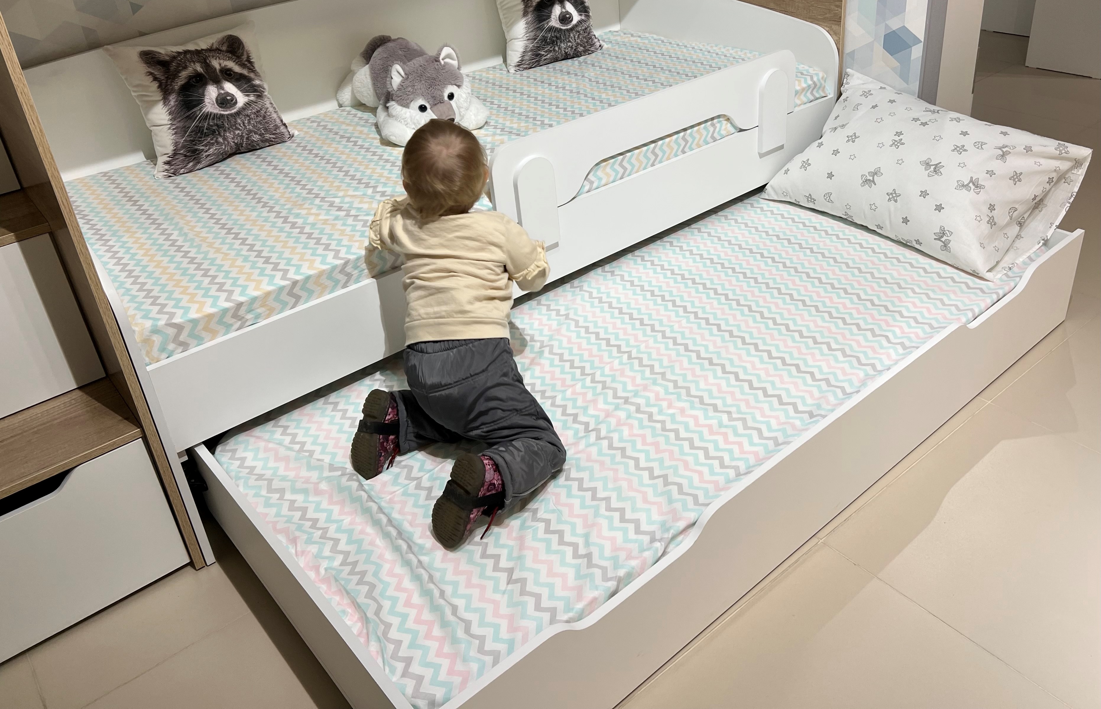 Экономия пространства: выдвижное спальное место легко убирается под основную кровать, освобождая место для игр и активного отдыха.