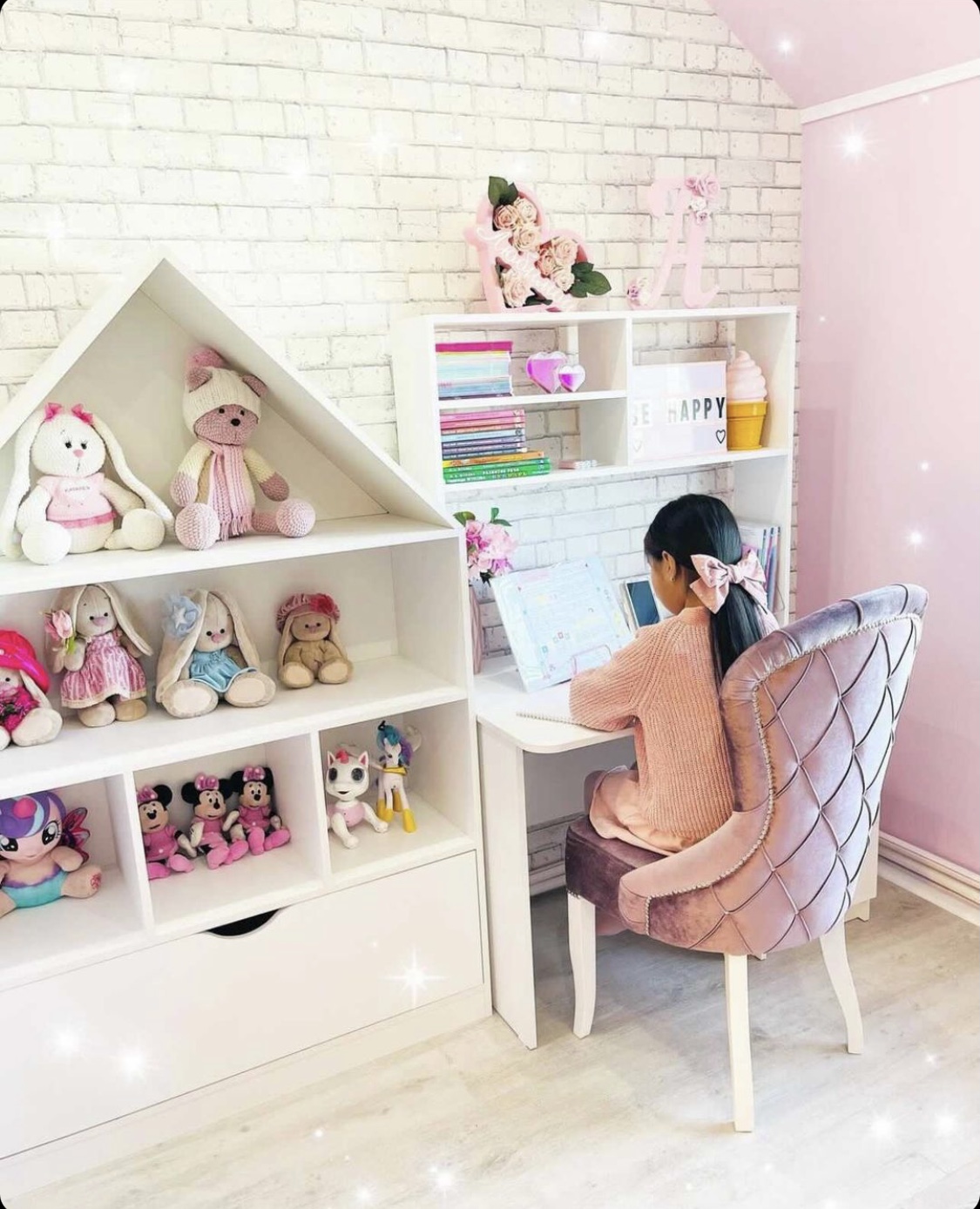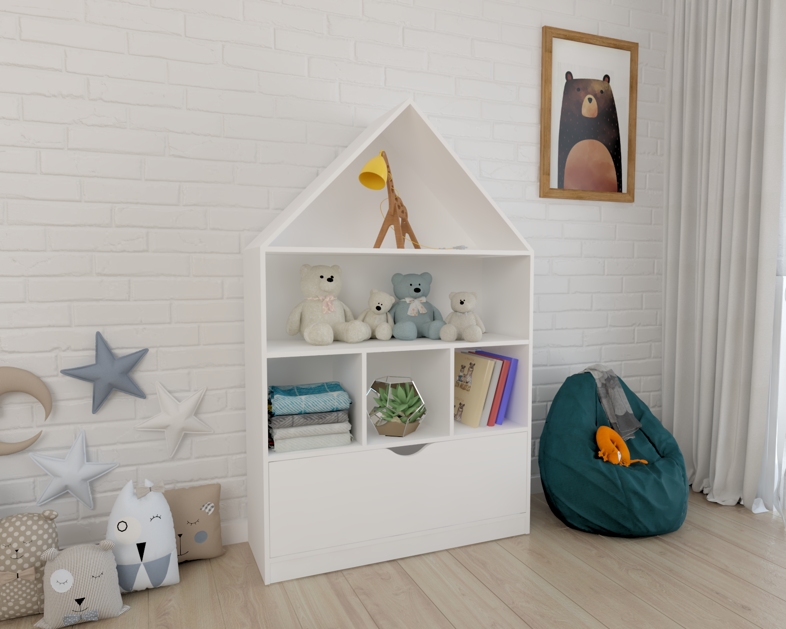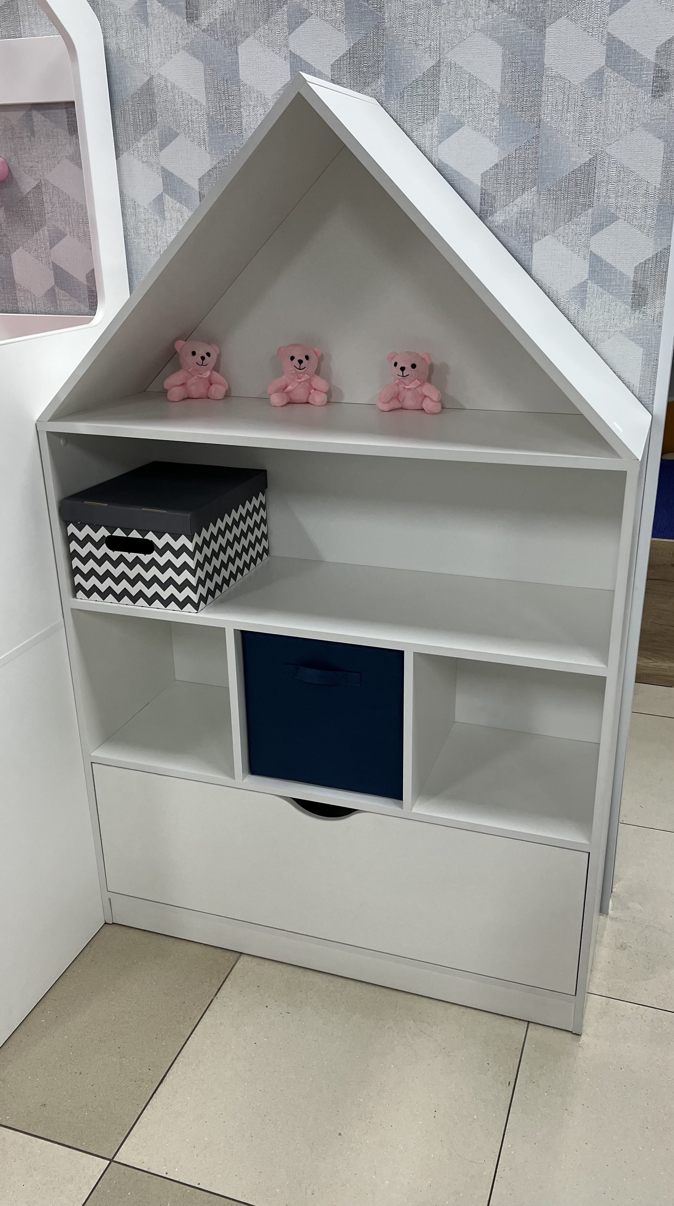 Стеллаж в виде домика - оригинальное и практичное дополнение в интерьере детской комнаты.