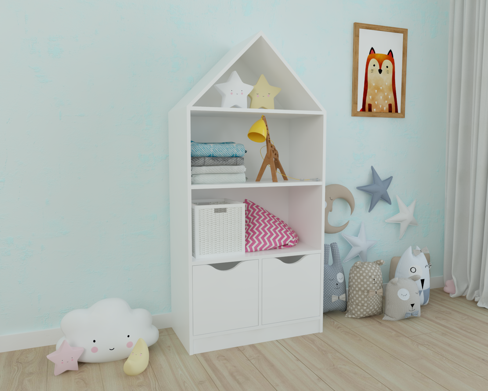 Стеллаж в виде домика - оригинальное и практичное дополнение в интерьере детской комнаты.