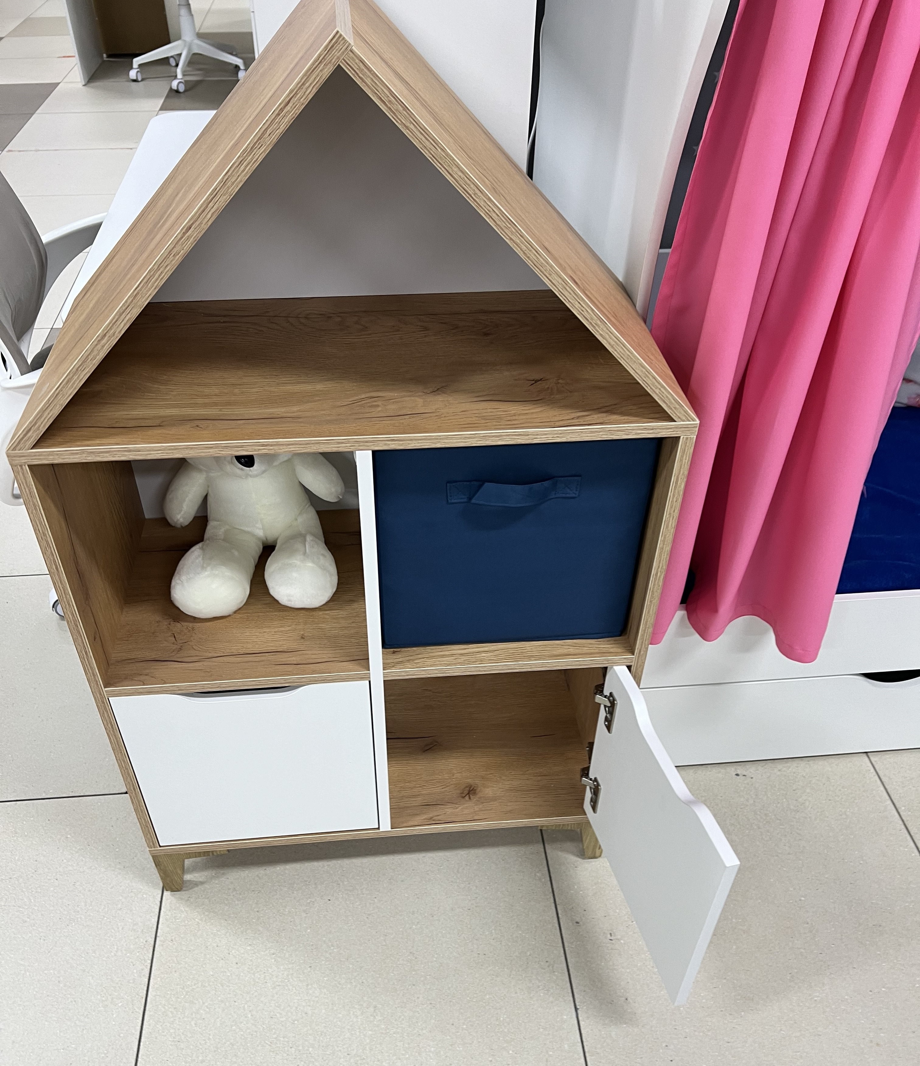 Стеллаж в виде домика - оригинальное и практичное дополнение в интерьере детской комнаты.