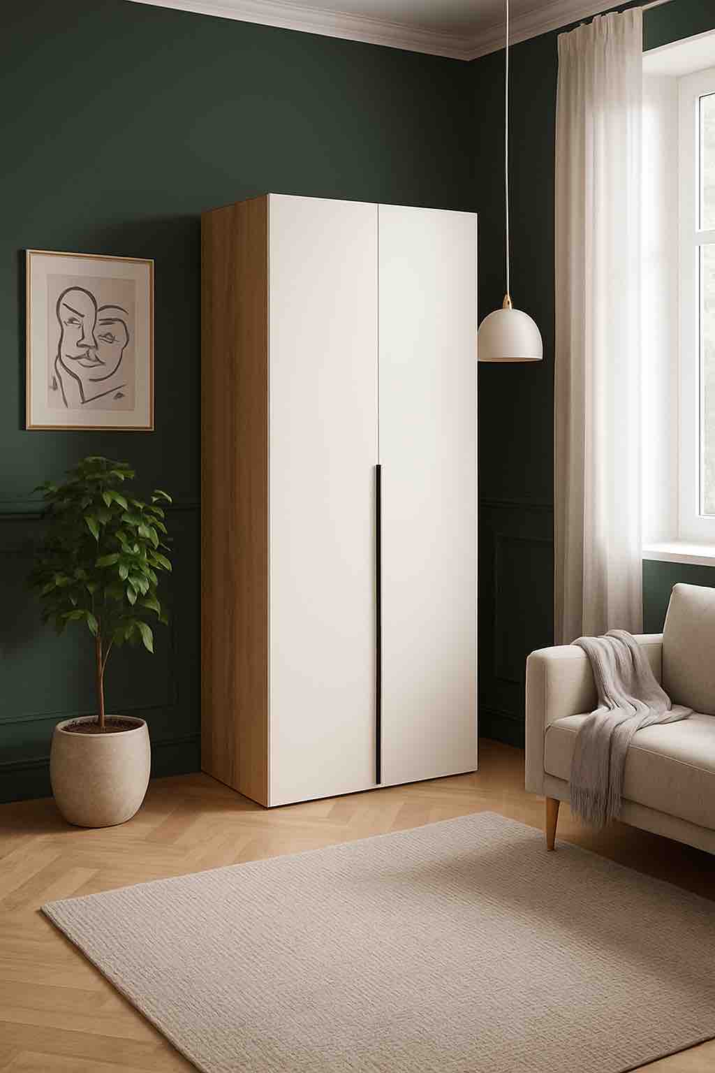 Натуральный декор дуб золотистый с выразительными полосами и следами от сучков прекрасно сочетается с однотонным белоснежным декором.