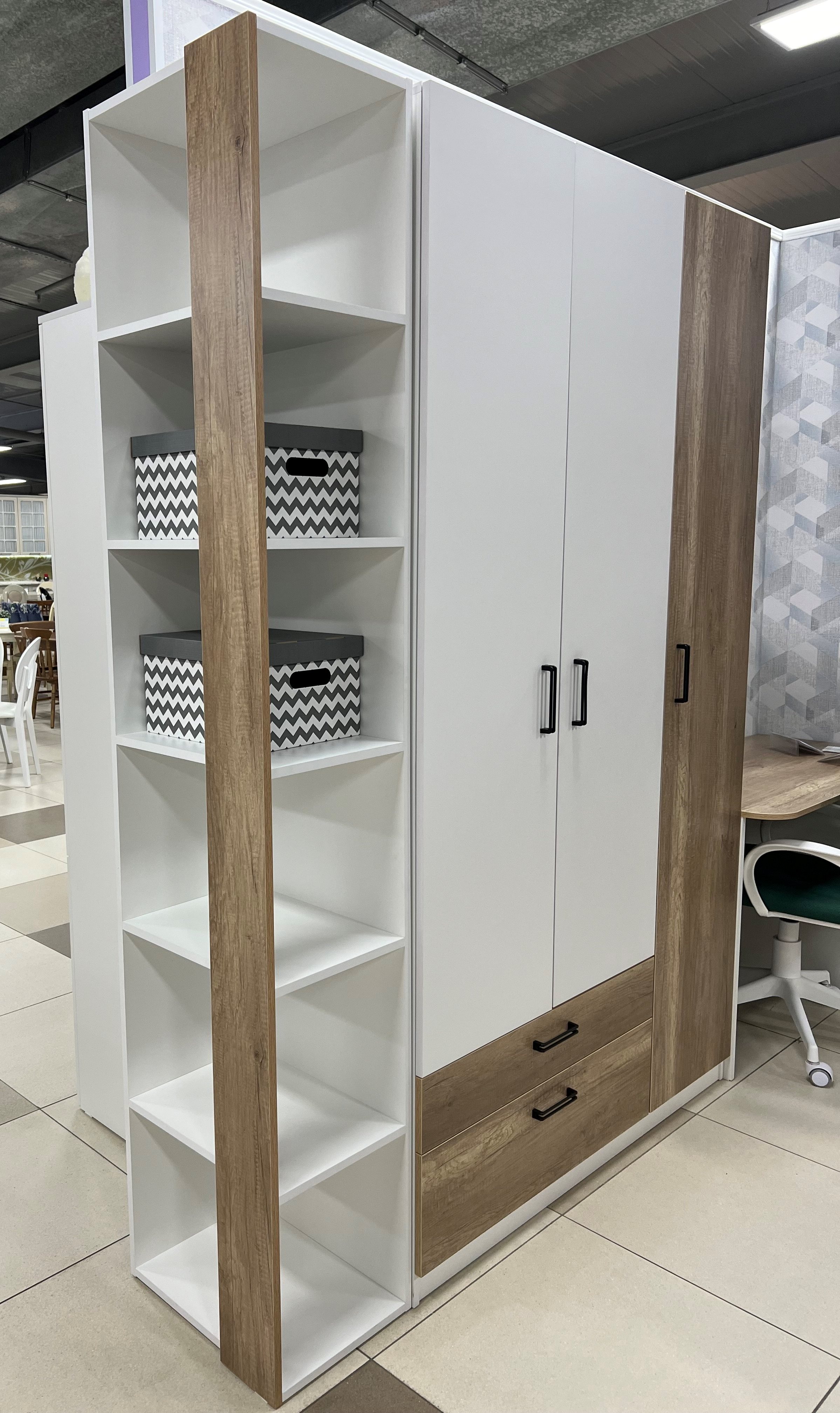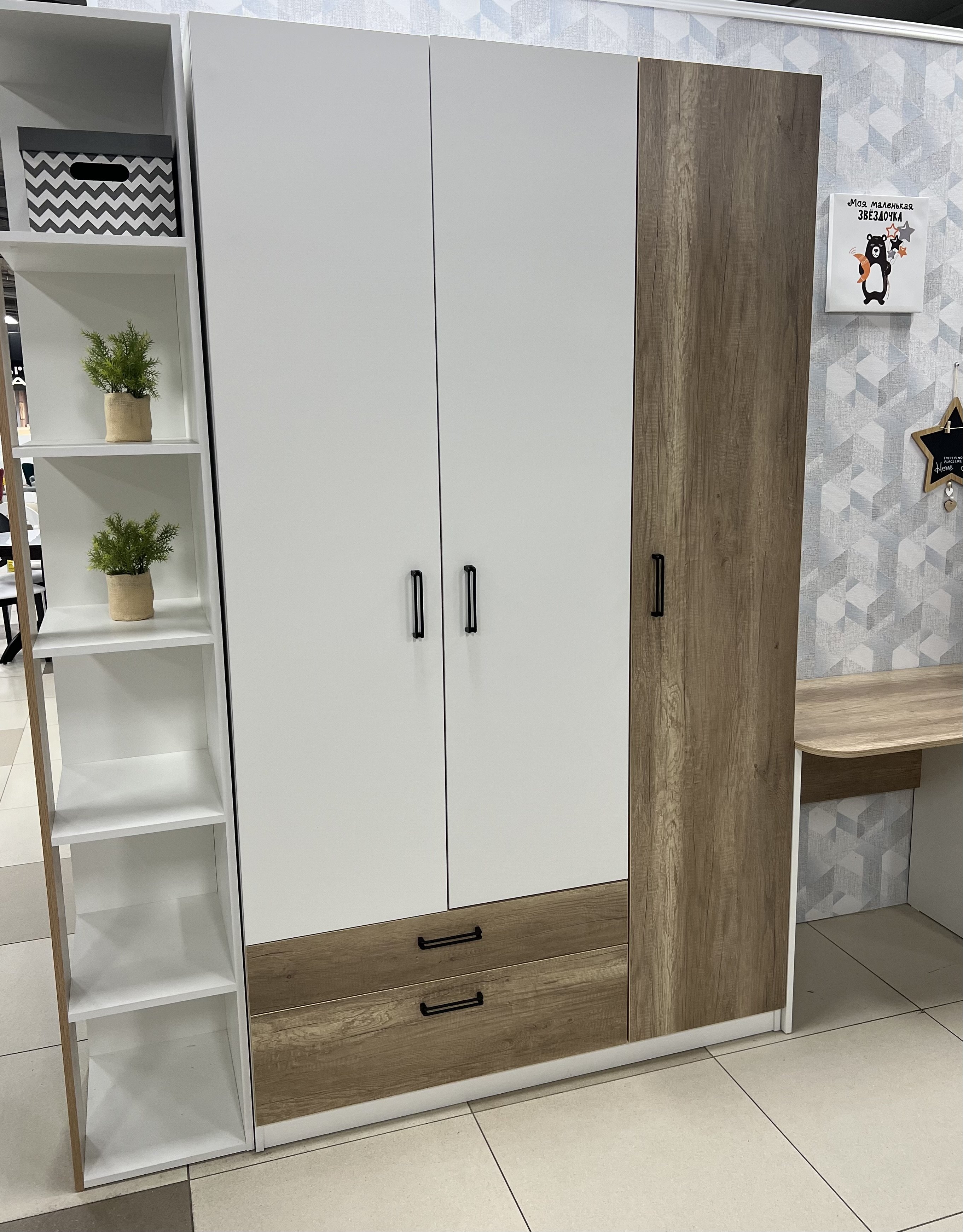 Мебель выполнена из сертифицированного, российского, качественного, экологически чистого ЛДСП Е0,5 в сочетании цветов дуб каньон + белый.