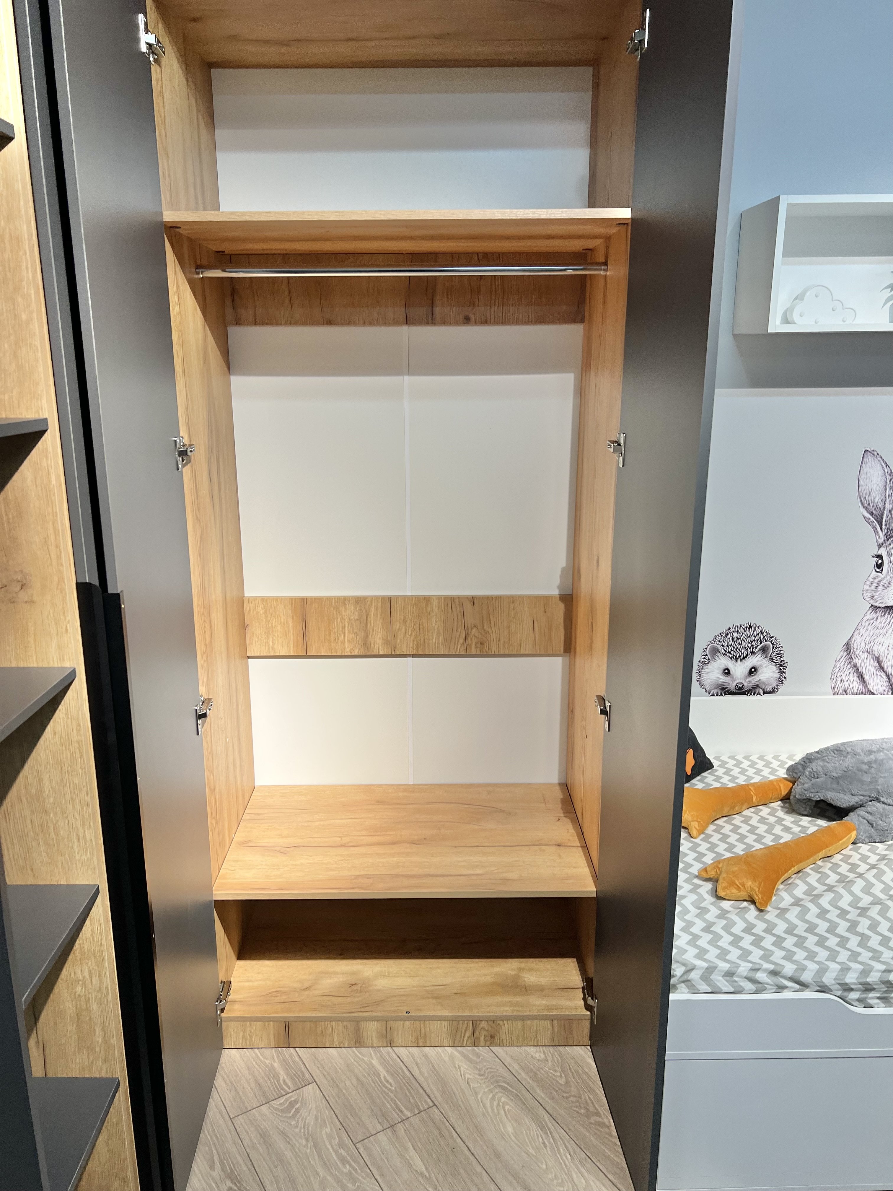Внутри шкафа расположены две штанги, верхняя и нижняя полки.