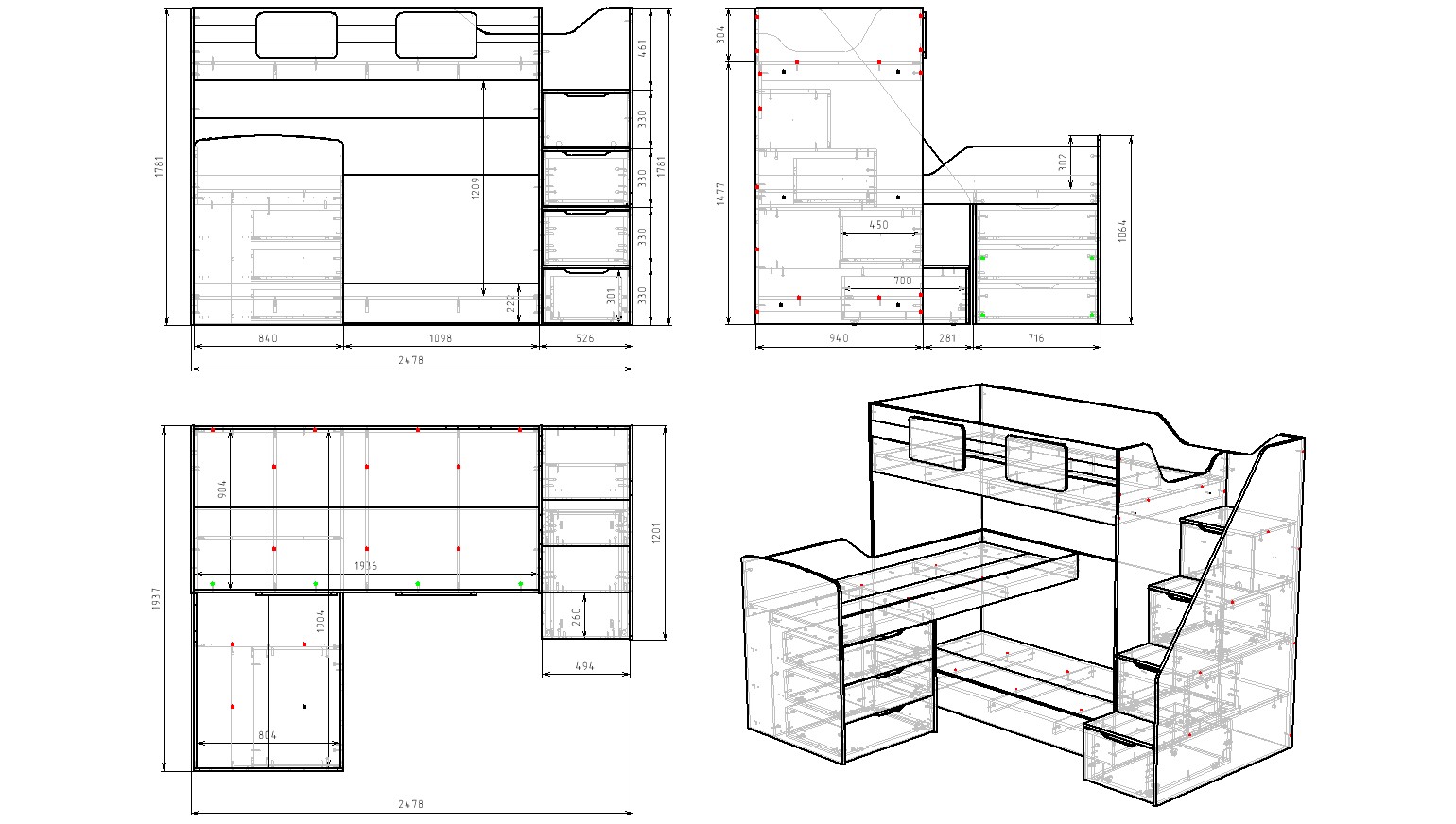 Габариты кровати: ширина 2478 х высота 1781 х глубина 1937 мм